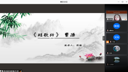 线上实训试讲验收评比活动的参与者有硕士生导师任美衡、李振中、朱迪光,研究生秘书文玲,2019级学科教学(语文)教育硕士研究生陈瑶、李玉婕、谭咏佳,以及2020级学科教学(语文)教育硕士部分研究生新生。