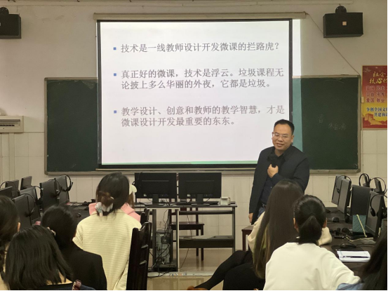 杨旭明教授先为大家解读第三届全国师范生微课大赛优秀作品征集与交流活动的赛事要求,他结合自身指导学生与教学微课制作的经验,提醒同学们们备赛的注意事项,分享了自己指导学生微课获奖作品和赛事中的其他院校的教师的获奖作品,并进行点评,他鼓励同学们们积极参与微课设计制作,不断学习,提升自身的教育技术水平,更好地辅助教学。在讲解中,杨旭明教授结合历届备赛经历,分享微课制作的流程,从选题、脚本撰写、教学设计、素材收集、PPT的制作到后期合成一一进行详细介绍,最后鼓励同学们勇于尝试,不要止于原地,不断提升自我,并现场点评了参赛选手制作的PPT。