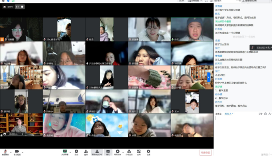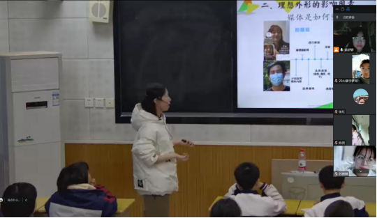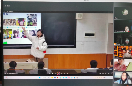 首先,尹洁老师与研究生在线就如何听课进行了交流探讨,她指出听课评课要注意的五个维度,即教学主题、教学目标、教学结构、教学逻辑、教学方法。然后,她组织研究生在线观看了衡师祁东附中王娟妍老师的以“我的理想外形”为主题的心育课。