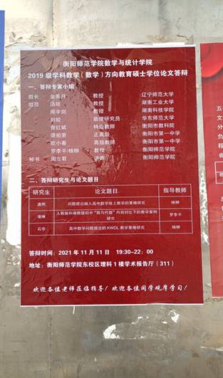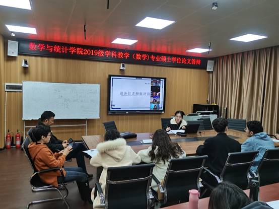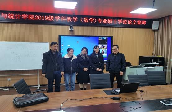 2021年11月11日晚上七点半至十点,数学与统计学院在理科一楼311教室举行数学与统计学院2019级学科教学(数学)专业硕士学位论文答辩会,由于疫情影响本次答辩会线上举行。