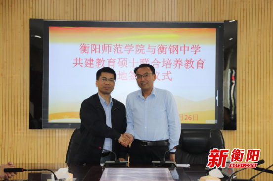 任美衡院长与郭平贵校长签署了《衡阳金年会与衡钢中学共建教育硕士联合培养教育基地协议》。任院长介绍了衡阳金年会硕士研究生招生情况,并肯定衡钢中学近年来在教育教学上取得的成就,期待两校以协同培养教育硕士为契机,在人才培养、师资培训、学术交流等方面进行深度合作,共同探索教师专业能力发展、教育硕士培养新模式。