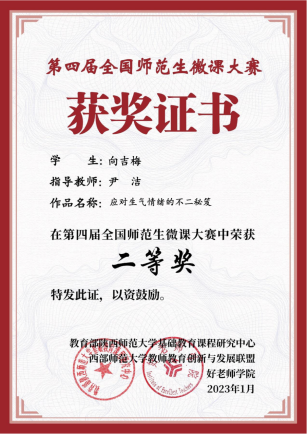 2023年1月4日,从全国师范生微课大赛官方平台传来喜讯,教育科学学院教育硕士教育管理专业领域2021级研究生向吉梅制作提交的《应对生气情绪的不二秘笈》获二等奖1项,该作品是由尹洁老师精心指导的。